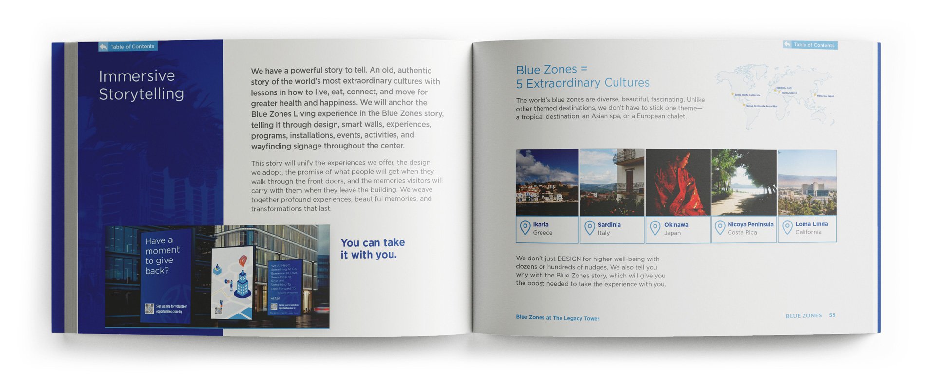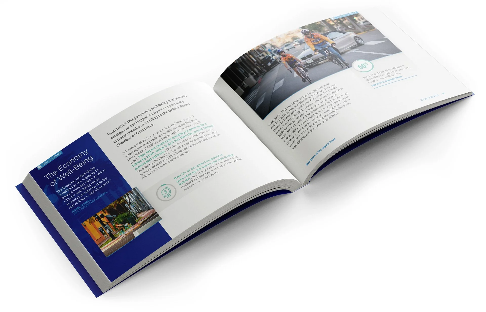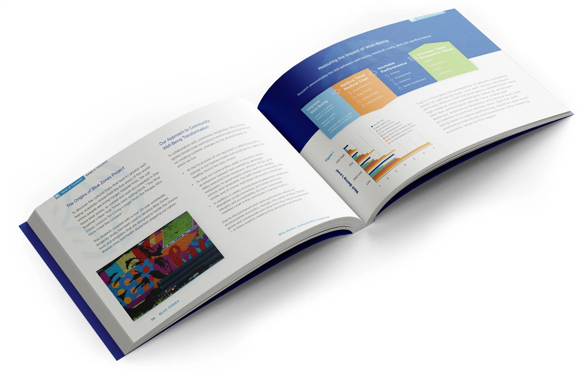 In this capacity I’ve shaped visual narratives that translate intricate ideas into elegant, digestible forms: infographics that clarify, data visualizations that illuminate patterns, spreads that balance precision with warmth. Each piece is crafted with careful attention to hierarchy, color, and rhythm, designed to reveal the heart of Blue Zones’ initiatives while honoring the humanity behind the numbers. The result is work that speaks with clarity and sophistication, inviting viewers to both understand and feel the impact of their work.